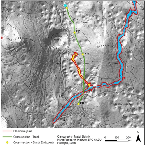 Field measurements were done on the unpaved forest road at the highest elevations of the limestone plateau between Postojna and Planina settlements (620-643 m a.s.l.). The track is crossing the known passage of Planina Cave filled with water (about 450 m a.s.l.) and a dry branch of the same cave (Fig.3). Both parts of the cave are located about 170-190 meters below the surface.