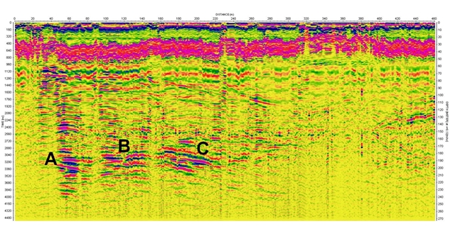 Other two important reflexes, probably from the unknown caves, are clearly recognizable at the horizontal positions of 10 m (B) and 175 m (C), both approximately at the same depth of about 100 m. Comparing with the profile p11, it seems that possible unknown cave level was developed at this depth. This can be related to Planinska Koliševka collapse doline, which bottom is located at an elevation of 557 m a.s.l. (about 40 m below the profiles).